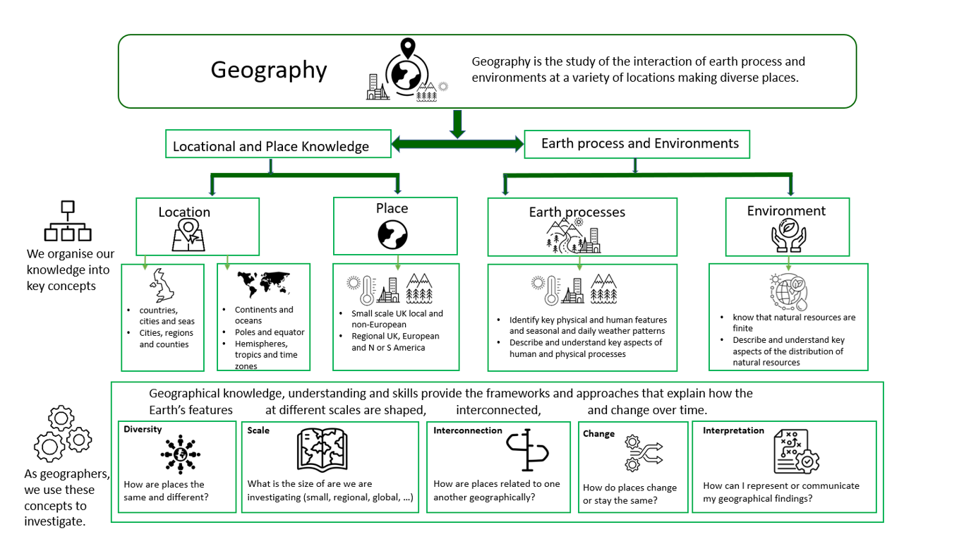 Geography supports children in understanding how human choices can affect the environment and the future of our planet. Through learning about topics such as climate change, sustainability and the use of natural resources, children begin to understand the importance of caring for the Earth.